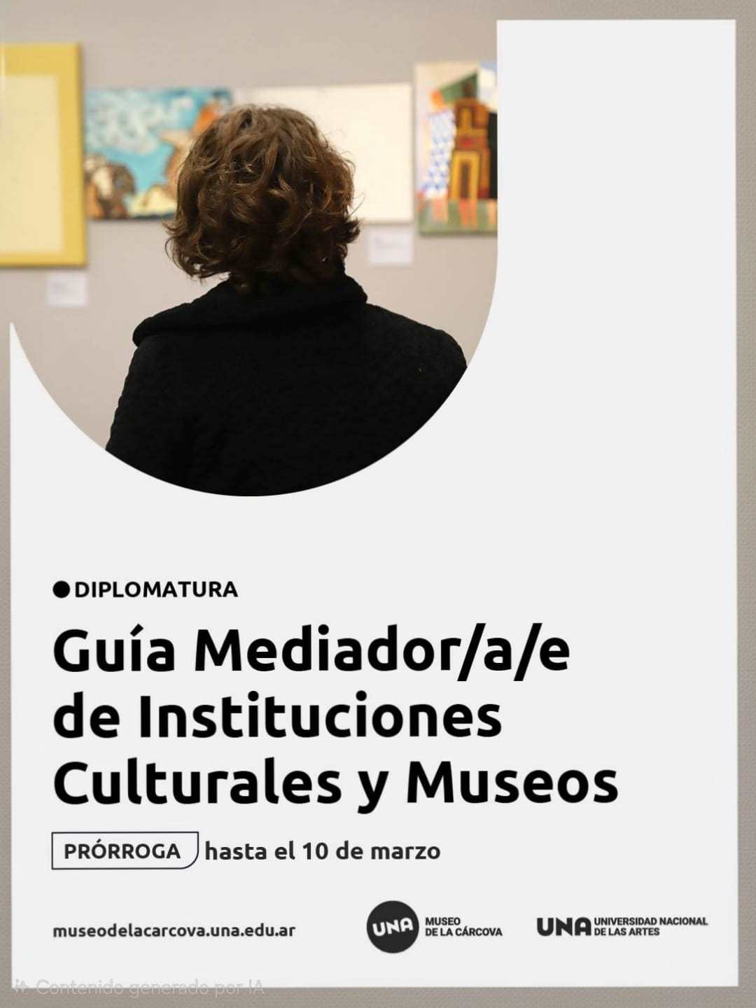 La Diplomatura para Guía Mediador/a/e de Instituciones Culturales y Museos es una propuesta de capacitación y especialización creada por la Universidad Nacional de las Artes y desarrollada por el Museo de la Cárcova - UNA. El objetivo de la Diplomatura es el de formar personas que, por su trabajo en diversas instituciones culturales, deban interactuar con el público. Dado que estos espacios se presentan hoy en contextos sociales que invitan a observar, conocer, aprender e interpelar los relatos, colecciones o exhibiciones varias, se debe contar con una formación integral para poder responder a estas demandas y brindar un servicio comprometido y empático. Mediante esta diplomatura se busca afianzar el vínculo de la universidad con las instituciones culturales de la región y el país, contribuyendo a la cadena de valor de la producción artística y cultural.